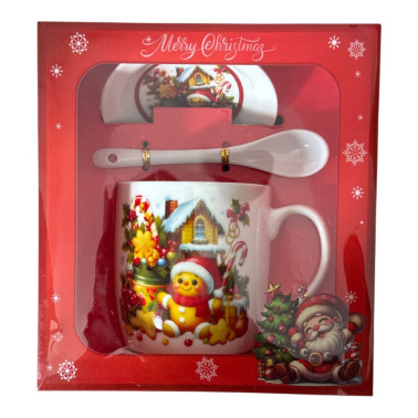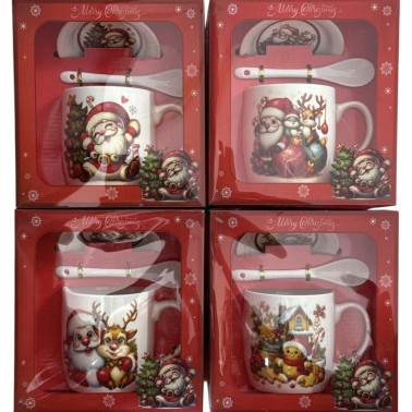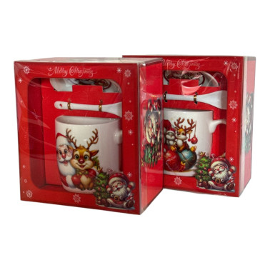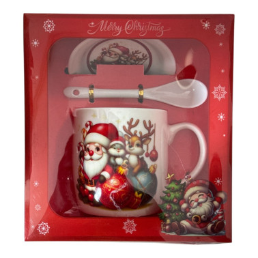 Setul este format dintr-o cană cu o farfurie cu linguriță și vine ambalat într-o cutie elegantă cu motive de Crăciun.