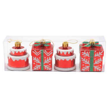 Set de 4 Globuri de Crăciun , model cadou și prăjitură cu sclipici, 7x4cm din plastic