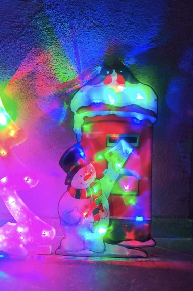 Designul tridimensional al decorațiunii oferă profunzime și dinamism, făcând personajele să pară vii și în mișcare. Lumina care se reflectă prin materialul semi-transparent creează un efect tridimensional natural, oferind senzația că omulețul de zăpadă chiar trimite scrisoarea sa magică către Moș Crăciun.