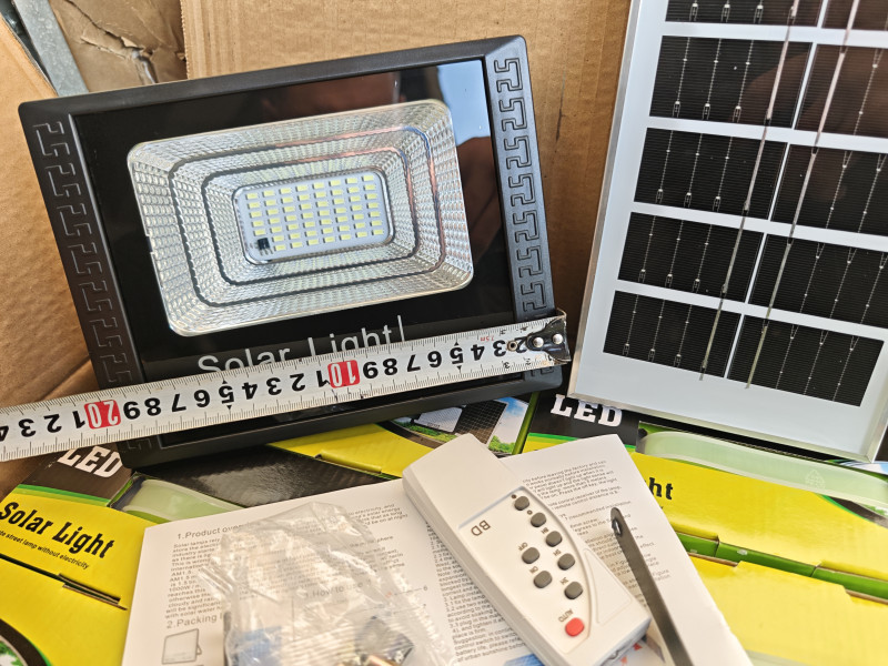 Lampă Solară de Exterior 50W cu Proiector si panou solar, 54 LED SMD, Telecomandă și Senzor de Lumină