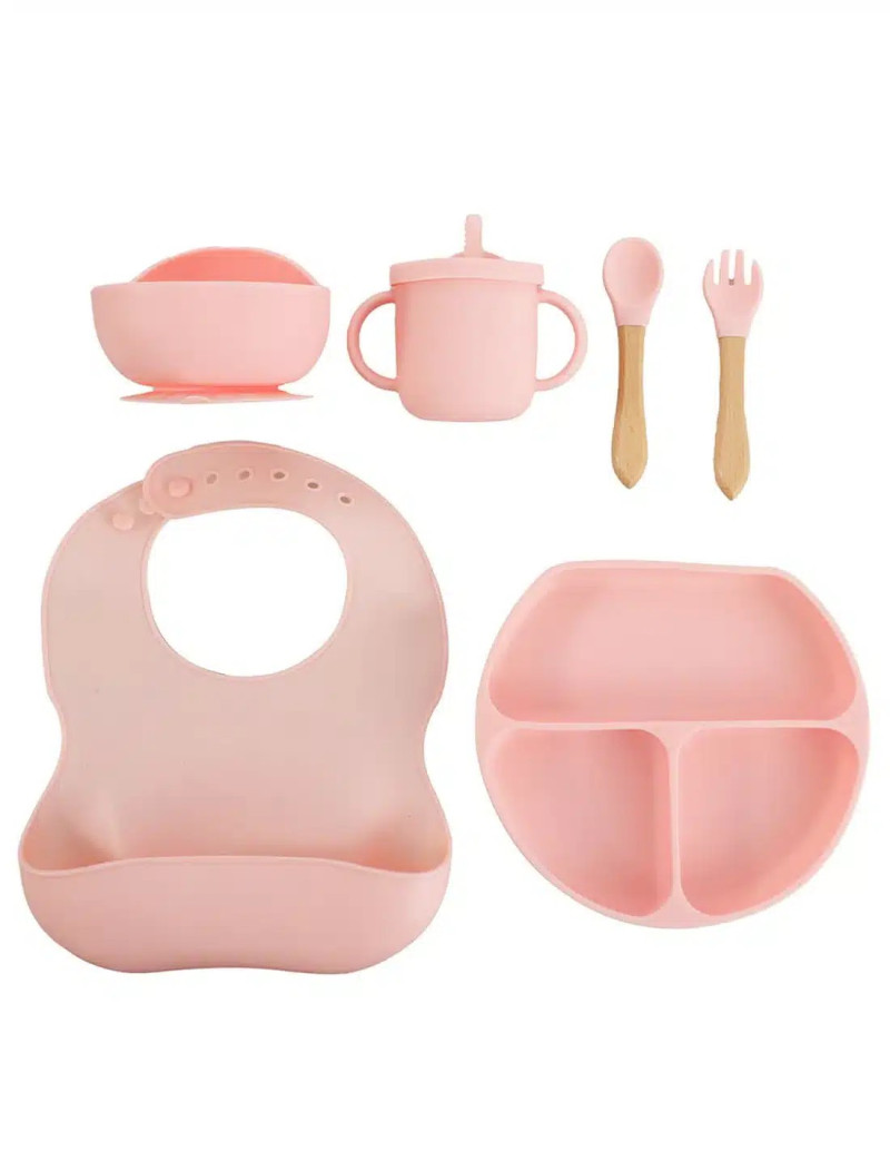 Set 6 piese diversificare bebelusi si copii din silicon baveta, farfurie compartimentata cu ventuza, bol cu ventuza