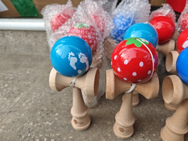 Realizată din lemn natural de înaltă calitate, kendama are o suprafață netedă, bine finisată, care oferă o aderență confortabilă în mână. Mânerul este proiectat ergonomic, permițând o prindere sigură și control precis în timpul jocului. Bila (tama) este vopsită într-un strat lucios, rezistent, disponibil în culori variate — roșu, albastru, roz sau natur — pentru a aduce un plus de stil și personalitate fiecărui model.